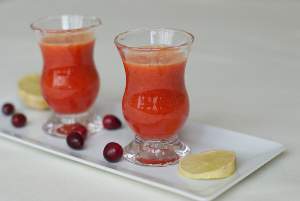 1) Blend 1 handful of cranberries, 1 peeled lime, 1/2 to 1 inch long piece of turmeric root, 1/4 cup of honey and 2 cups of coconut water or water. Taste and add more honey if needed. Toast to good health. Enjoy!