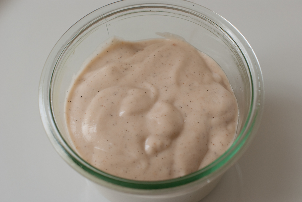 2) Make the Coconut Cream- Make a coconut cream from scratch with a young coconut or scrape out the cream in a refrigerated can of coconut milk. (The cream will separate from the coconut water.) To make it from scratch, buy the young coconuts at whole foods or a health food store. Use a sharp knife to cut off the top. Then use an everyday spoon to scrape out the coconut meat. Blend all the coconut meat in a Cuisinart or blender with about 1/4 cup of coconut milk, a tablespoon of coconut sugar, and a teaspoon of vanilla paste with vanilla beans. Slowly add the coconut milk to find the desired smoothness. Add a dollop of coconut cream on top and sprinkle with blueberries or raspberries. It is that easy. Enjoy!