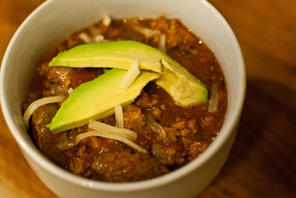 7) Place the beans in a bowl and then add the chili meat sauce. Sprinkle so gouda or cheddar and add some avocado pieces. Sour cream is very good with this chili too and will mellow the spice. Enjoy!