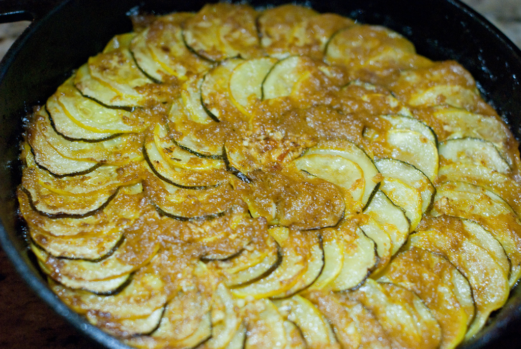 3) Slice the zucchini and yellow squash in 1/8″ slices with the mandoline. (I could not get the tomato to slice on the mandoline since they were too soft. Instead I sliced them by hand and placed the tomatoes on the piperade since they were not the prettiest. )After slicing, start in the middle and work your way outward by alternating the squash and zucchini (and tomato if thinly sliced) until you complete the spiral pattern below. Add the chopped garlic and thyme. Drizzle with olive oil.