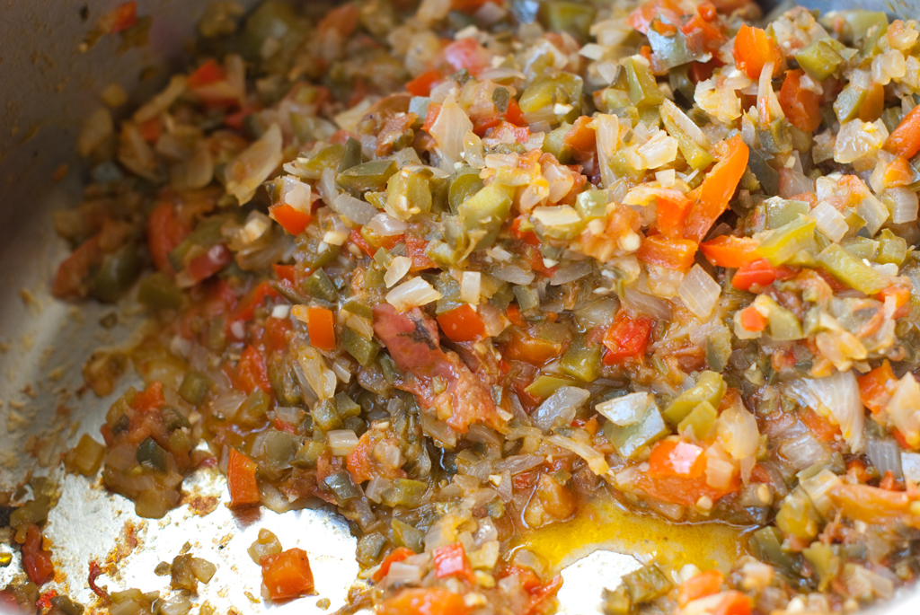 2) Make the piperade (click for detailed directions) and spread along the bottom of the dish about 1 inch in thickness. I pureed the piperade for a creamy sauce.