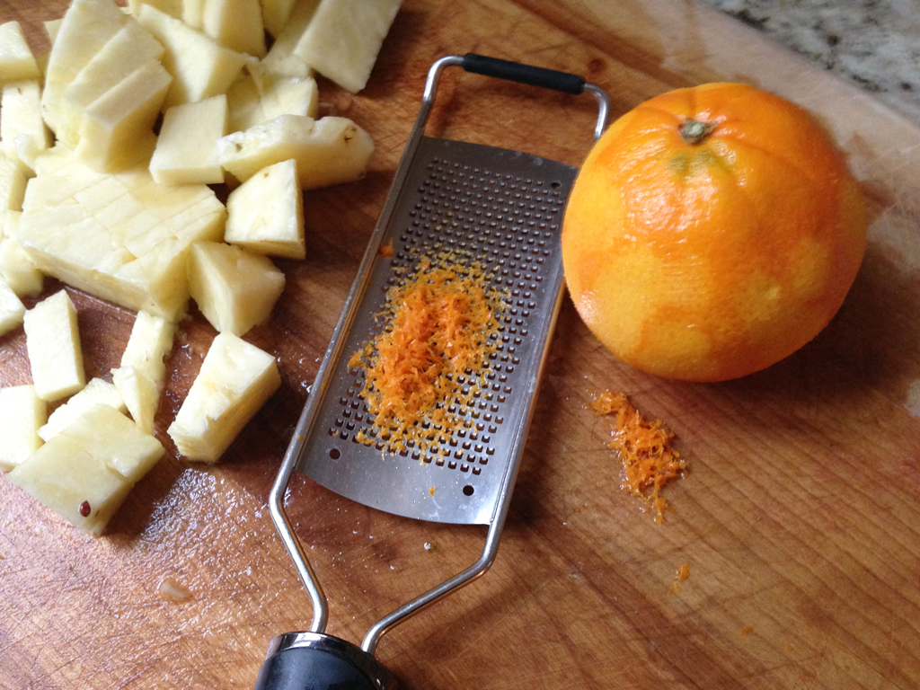 1) Chop half of a pineapple and throw into you blender. You should have about 1 cup of diced pineapple. Now zest and peel the orange. Slice open the orange and remove the seeds. Then add the orange to the blender. Purée the pineapple and orange. You should have 2 cups of purée.