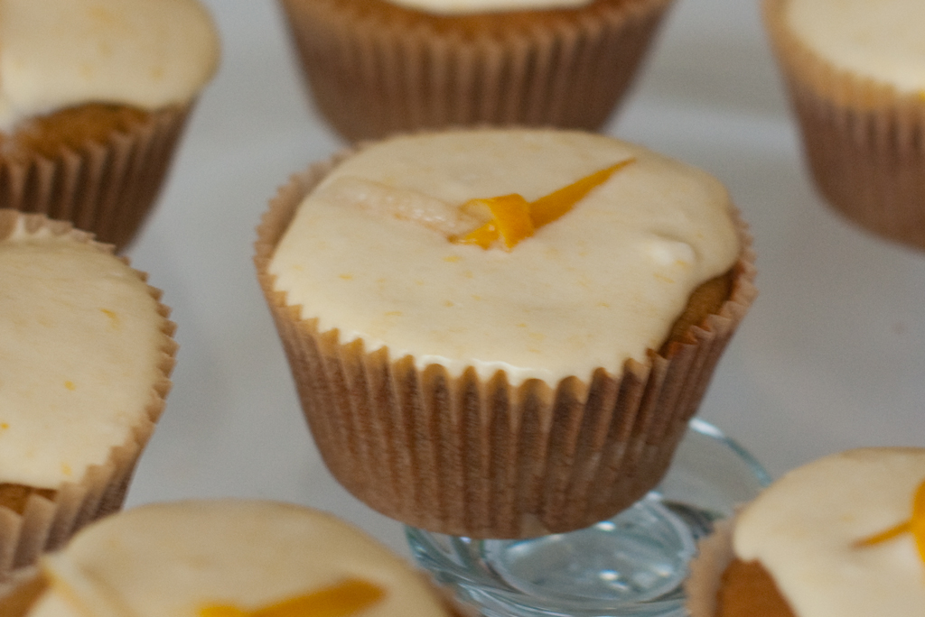 8) Ice the cupcakes and add a piece of lemon or orange peel on top for a garnish or decorate for Halloween. Enjoy!
