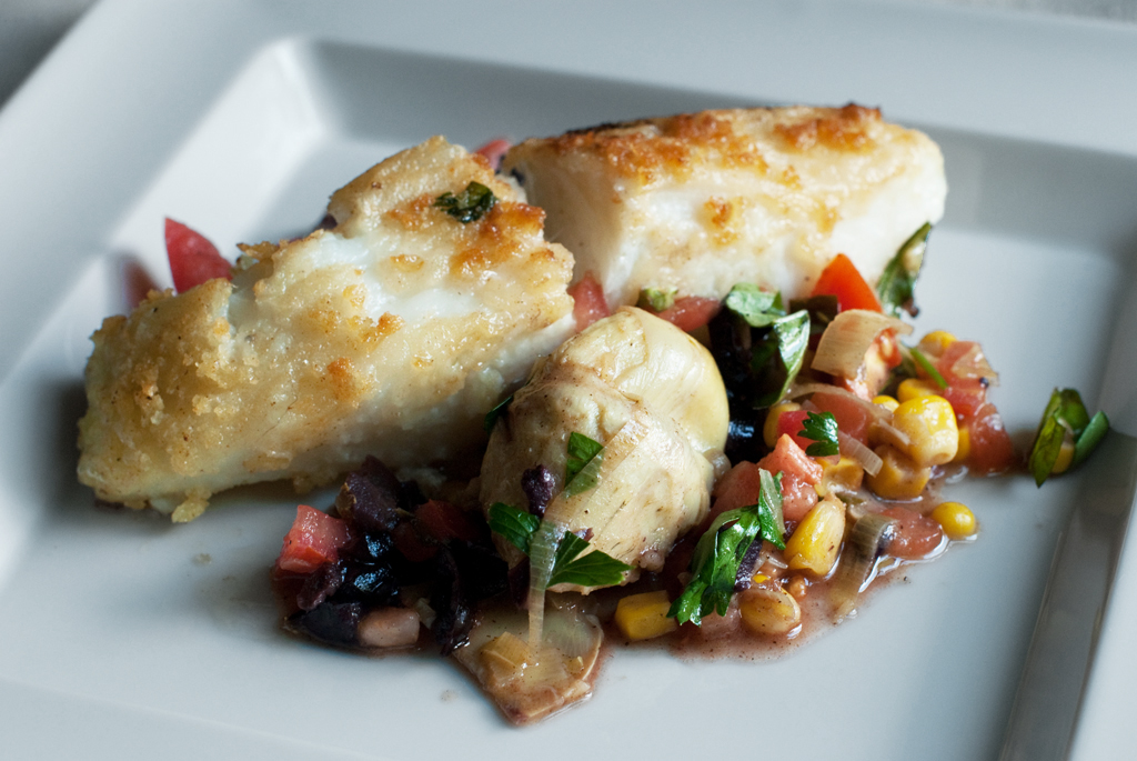 Light and crispy sea bass with summer fresh vegetables. The artichokes, plum tomatoes, basil, parsley, olives, corn and leeks are sautéed in a white wine and chicken stock creating the perfect compliment to the sea bass.