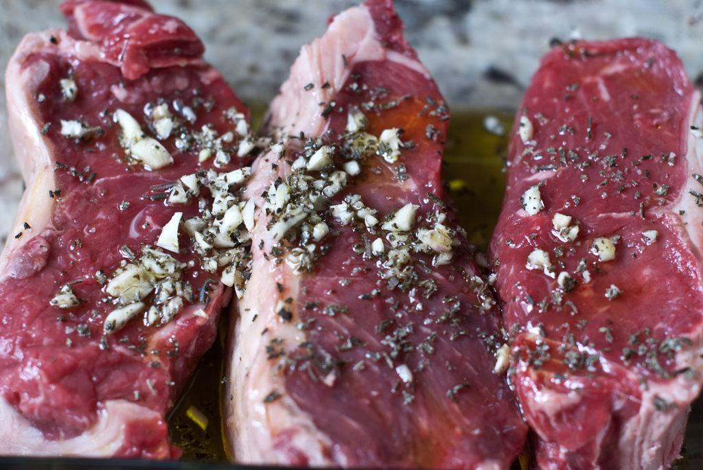 With a high quality steak you can flavor the meat with a simple marinade, sea salt and black pepper. Since I do not like pepper, I add fresh herbs and my preference is rosemary. I also add some garlic for the anti-inflammatory properties and taste.